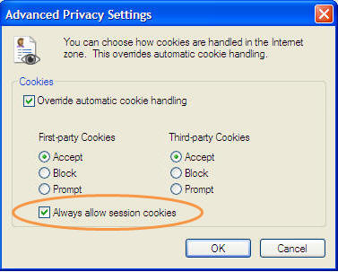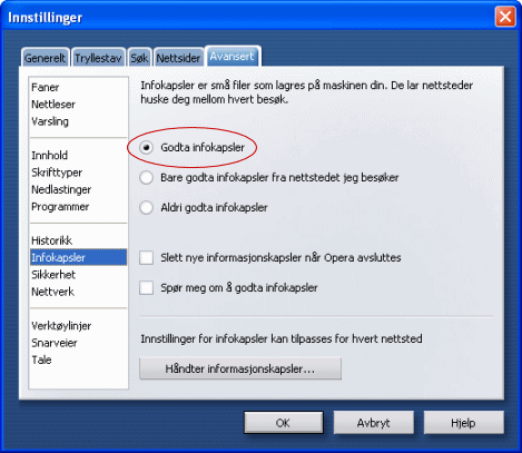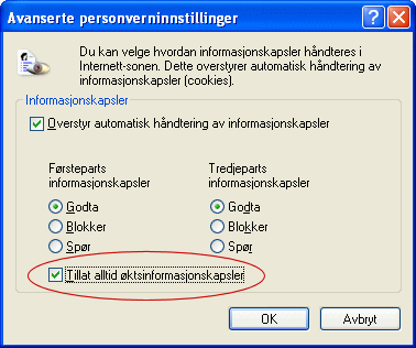 5. Merk avhukingsboksen Tillat alltid øktsinformasjonskapsler
