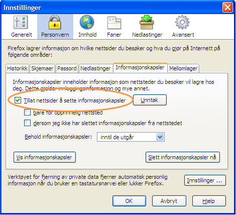 Under følger en forklaring på hvordan du skal tillate cookies i de forskjellige nettleserene: